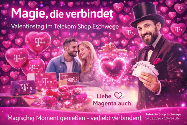 Am 14. Februar 2026 verwandelt sich der Telekom Shop Eschwege von 9:00 bis 14:00 Uhr in einen Ort voller Staunen, Nähe und überraschender Verbindungen. Ein professioneller Magier nimmt unsere Besucher mit auf eine Reise zwischen Close-up-Zauberei, mentalen Effekten und kleinen Wundern, die direkt vor den eigenen Augen entstehen – ganz nah, ganz persönlich.